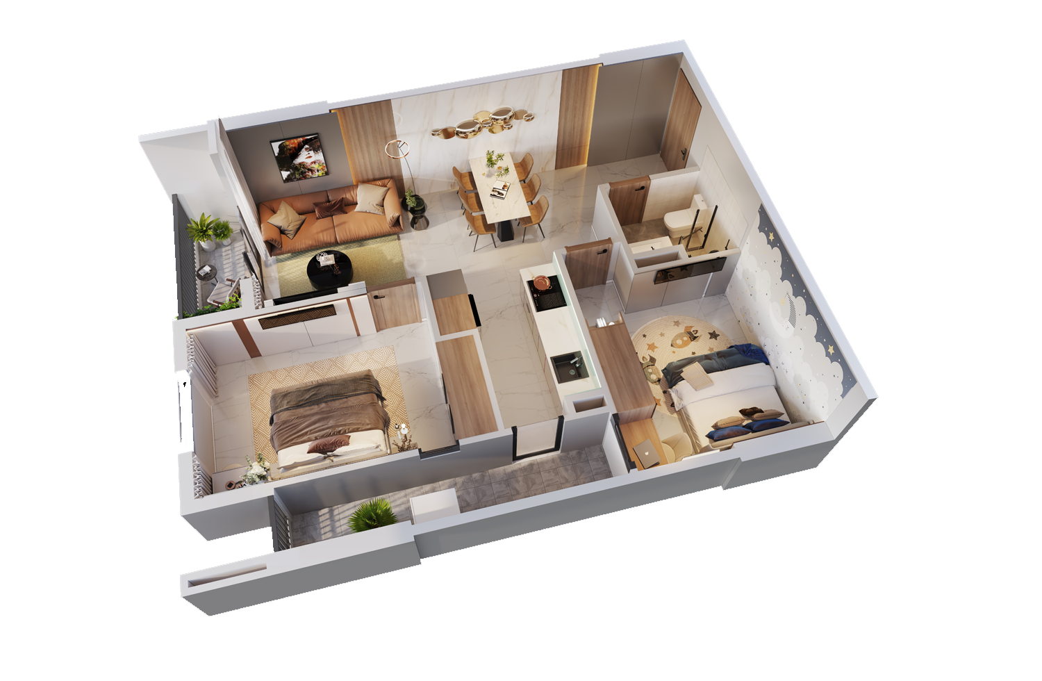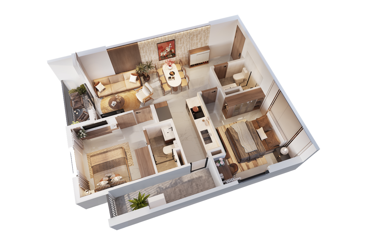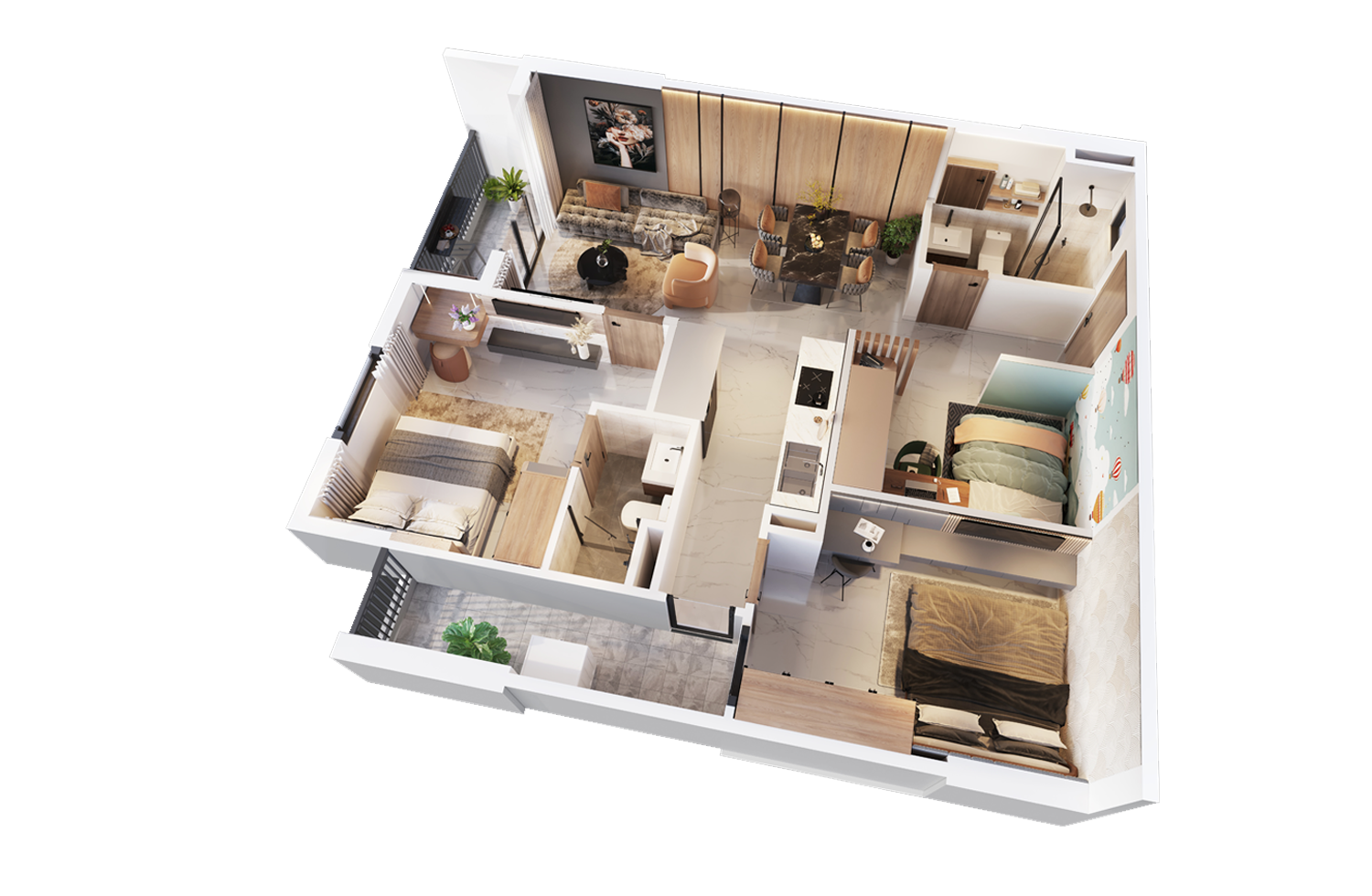 - Căn hộ 2 phòng ngủ: 62,5m2 đến 67,7m2